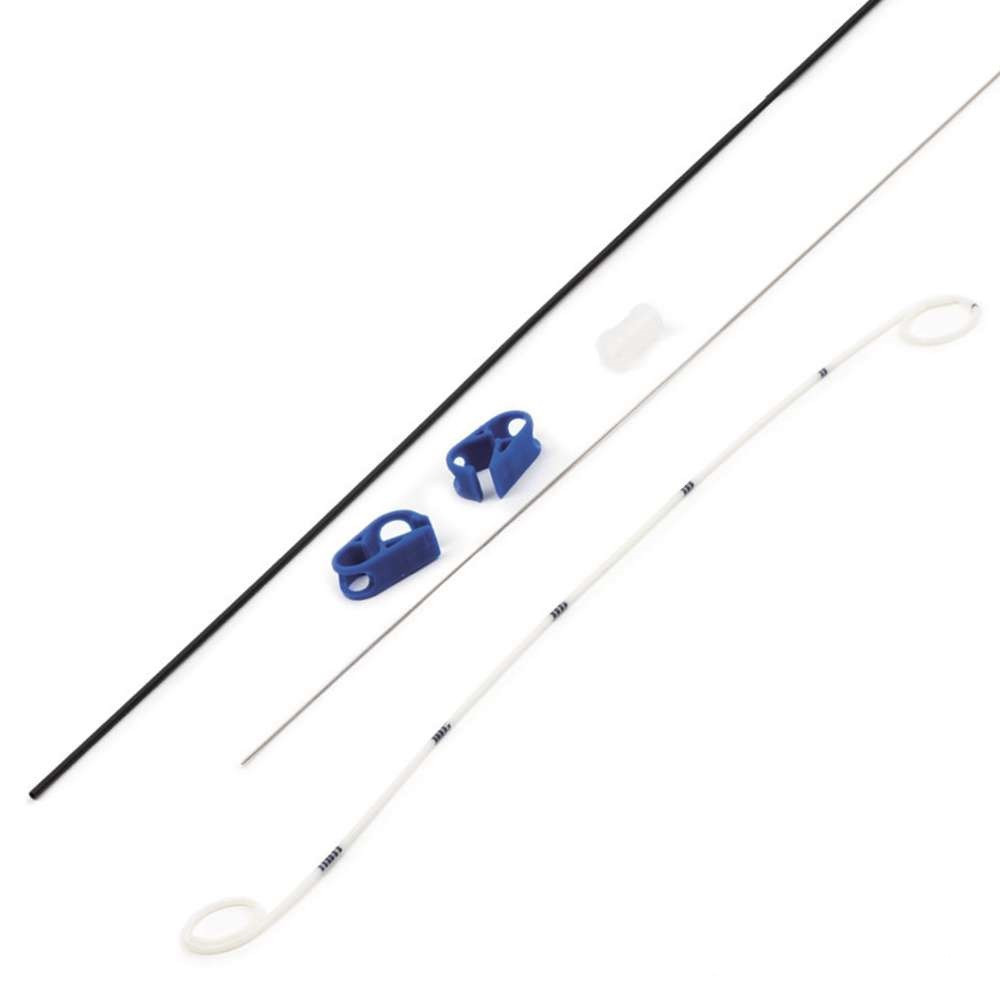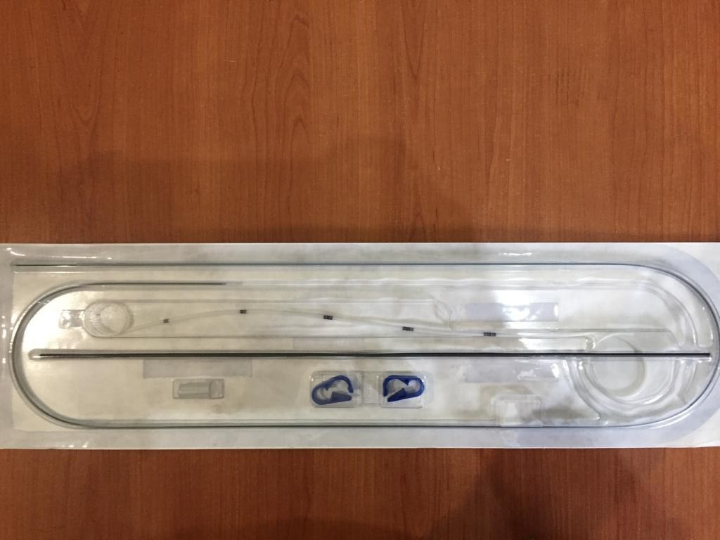 - Проводник изготовлен из нержавеющей стали, его диаметр 0,038“, а длина 90 см. После введения его внутрь катетера, он выпрямляет обе петли, что позволяет ввести катетер в рабочий канал эндоскопа, а затем в мочевой пузырь и почку.