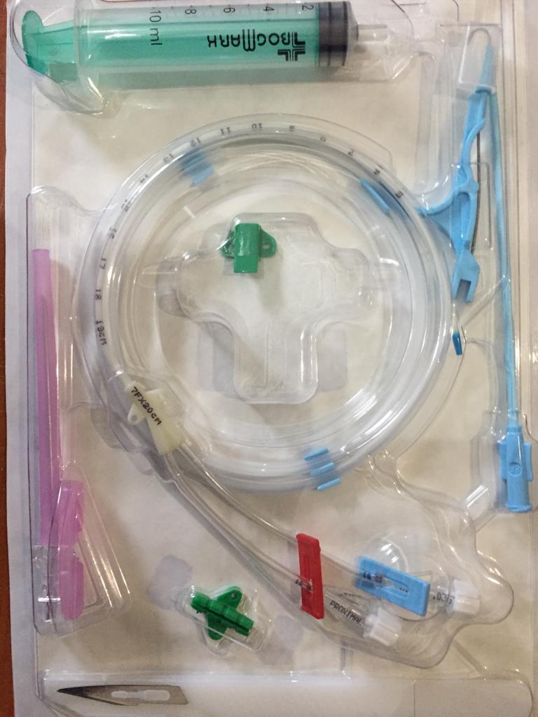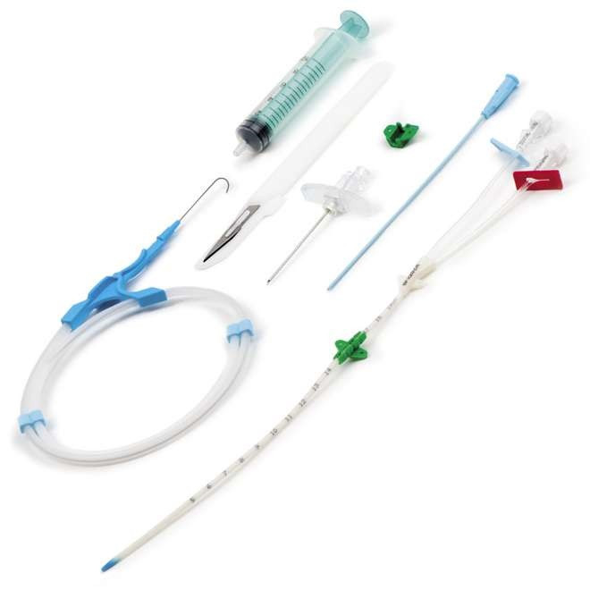 Катетер для центральных вен (набор по Сельдингеру), двухканальный. Используется для катетеризации крупных сосудов. Изготовлен из щадящего ткани полиуретана, градуирован для облегчения контроля за глубиной его введения. Упакован в блистер вместе с набором для установки, в состав которого входят: проводящая игла, дилататор, проводник, шприц, крылышки для фиксации, заглушка с инъекционной вставкой. Имеет мягкий, атравматичный кончик. Стерилен.
